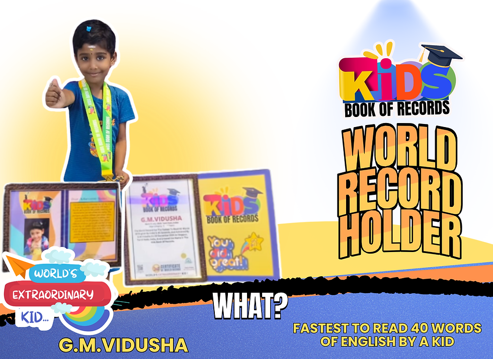 Young Genius from Tiruppur Sets Record for Fastest Reading by a Kid In a remarkable display of early learning and focus, a young child from Tamil Nadu has created history in the field of child achievement. G.M. Vidusha has set a new benchmark by accomplishing the World Record for the Fastest to Read 40 English Words by a Kid in just 45 seconds.